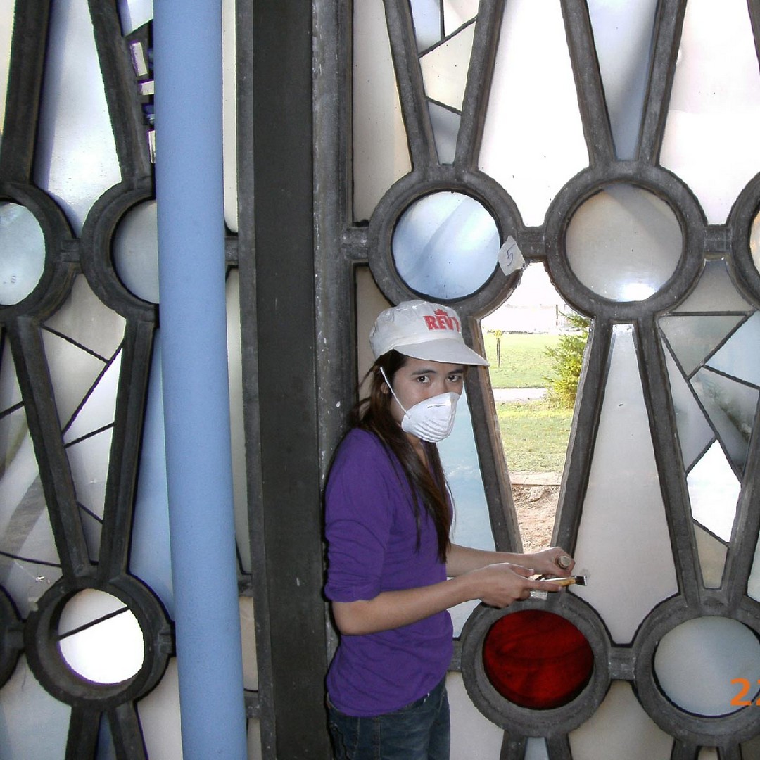Unsere erstes Problem war es, entsprechendes Glas zu finden. Die Firma (Fischer Glas), die die ursprünglichen Gläser hergestellt hat, gibt es nicht mehr. Glücklicherweise konnten wir dann doch noch ein paar Scheiben auftreiben und an den nicht so sichtbaren Stellen verwendeten wir ähnliches Glas von der Firma Lamberts. Um die Arbeit vor Ort durchzuführen, richteten wir einen "Shop" ein - d.h. wir nahmen den Toilettenvorraum in Beschlag und stellten dort Tische und Werkbank auf; dann zogen wir ein. Die Arbeit bestand daraus, die kaputten Scheiben aus den Betonrippen herauszukratzen, dann ihre ursprüngliche Größe auf einer Papierschablone festzuhalten und mittels dieser neue Scheiben aus unserem mitgebrachten Glasvorrat zu schneiden. Die neuen Glasstücke wurden dann in unserem "Shop" an Ort und Stelle geschliffen, sodass wir uns an die Arbeit machen konnten, sie wieder in die Betonrippen einzukitten. Da die Fensterfront meterhoch war, waren wir die meiste Zeit auf eine Hebebühne angewiesen. Besondere Schwierigkeit bereitete die Abdichtung von Außen, welche mittels einem speziellen Betonkit erreicht wurde. Nach drei Tagen war alle Arbeit getan.
