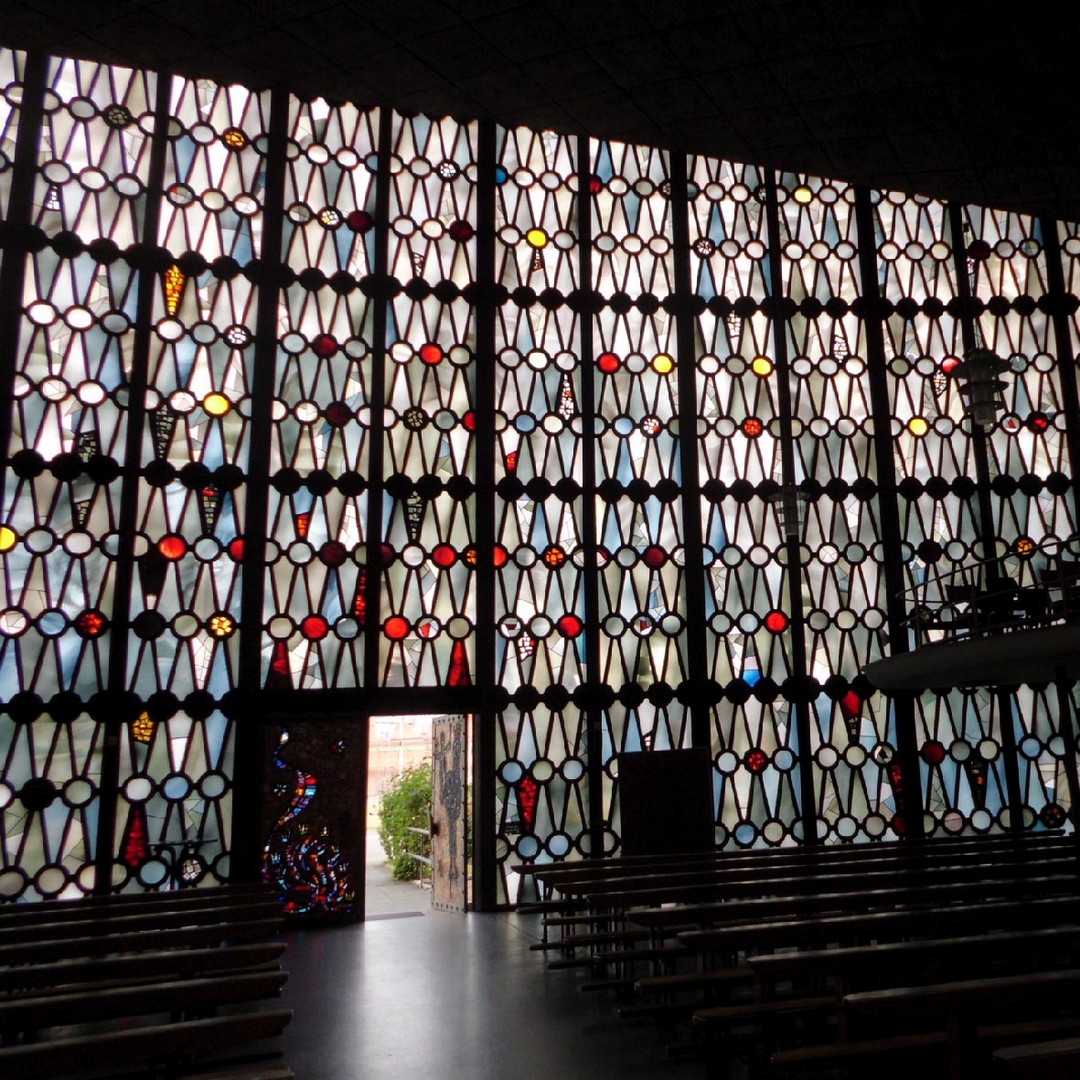 Im Inneren finden wir viele Bezüge zur Apokalypse, so zeigt das zweiflügelige Mittelportal den Kampf des Satans gegen die Kirche. Die riesige, über 10 Meter hohe Fensterwand aus mehr als 3.000 Einzelfeldern mit schmalen Beton-Rippen ist in blauen und grauen Farbtönen gehalten und soll den „neuen Himmel“ der Apokalypse in Erinnerung bringen. Besonders die Abendsonne lässt die große gläserne Fassade wie Edelsteine aufleuchten. Die Kirche wurde 1996 unter Denkmalschutz gestellt.